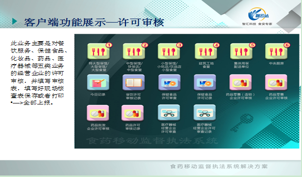 食藥移動監(jiān)督執(zhí)法系統(tǒng)是食品藥品監(jiān)督管理領(lǐng)域移動監(jiān)督執(zhí)法綜合服務(wù)系統(tǒng),主要用于食品藥品監(jiān)督管理部門移動監(jiān)管執(zhí)法使用。執(zhí)法人員可以手持客戶端現(xiàn)場檢測,錄像、錄音拍照等證據(jù)獲取,并依照法律法規(guī)對監(jiān)管對象進(jìn)行動態(tài)出證、等級評審、許可審核和日常巡檢等業(yè)務(wù)工作處理,并上報處理結(jié)果數(shù)據(jù)。監(jiān)管人員根據(jù)執(zhí)法采集的數(shù)據(jù),及系統(tǒng)自動收集到的輿情信息,實現(xiàn)了食藥監(jiān)管部門對所轄區(qū)內(nèi)的食品安全問題重點監(jiān)管工作。