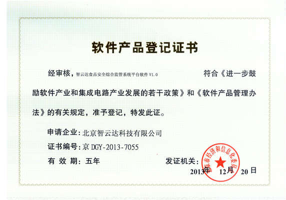 軟件產(chǎn)品登記證書——智云達食品安全綜合監(jiān)管體統(tǒng)平臺軟件