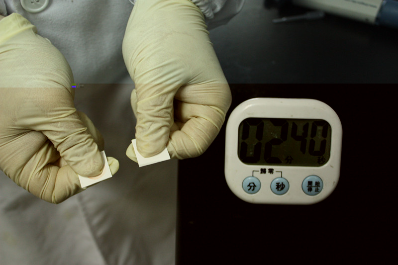 3. 取2片農(nóng)殘卡,分別往白色藥片上滴上樣品提取液和蒸餾水,放置 10min。