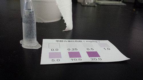 (3)結(jié)果:顏色相同或相近的比色卡色階示值為無(wú)色液體樣品中甲醛含量mg/L;顏色相同或相近的比色卡色階示值乘以10即為固體樣品中甲醛含量mg/kg。若顏色超出色