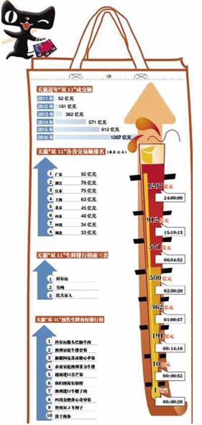 2016年的天貓“雙11”購物狂歡節(jié)已正式落下帷幕,全天總交易額達(dá)到了1207.49億元,其中無線交易額占比81.87%,交易覆蓋235個(gè)國家和地區(qū)。這是繼2015年912億元、2014年571億元之后,又一次刷新的成交額記錄。其他電商平臺(tái)如京東等,在此次“雙11”中也是戰(zhàn)績(jī)斐然,連創(chuàng)新高。