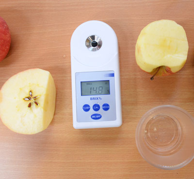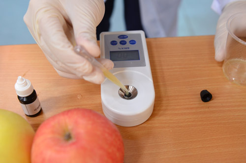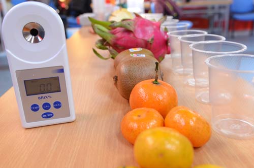 北京智云達技術工程師楊老師和王老師首先將水果去皮榨汁,不加水,再通過使用北京智云達自主研發(fā)生產(chǎn)的快速檢測產(chǎn)品:數(shù)顯糖度儀,對樣品溶液的糖度進行檢測。