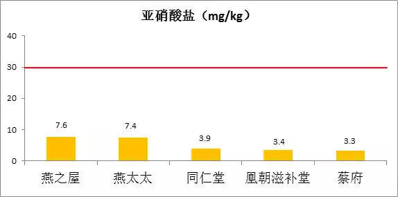 此次檢測(cè)結(jié)果顯示,五品牌燕窩的亞硝酸鹽含量均低于10mg/kg,符合限量值規(guī)定。