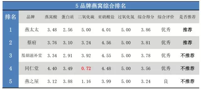 根據(jù)以上檢測(cè)結(jié)果,五大品牌燕窩的綜合排名為: