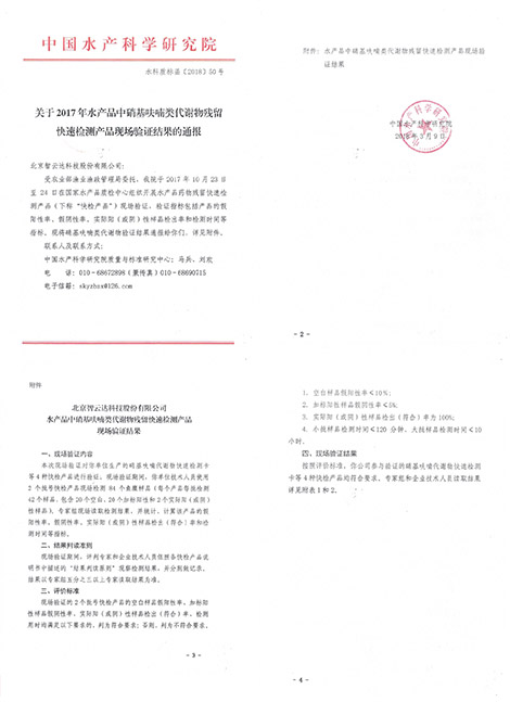 中國水產科學研究院質量與標準研究中心受農業(yè)部漁業(yè)漁政管理局委托 ,運用智云達自主研發(fā)的水產品快檢產品,對水產品中硝基呋喃類代謝物進行快速檢測。2017年10月23日-24日,該檢測在國家水產品質檢中心順利開展。驗證結果如下: