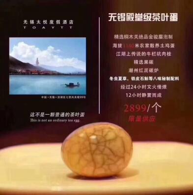 “精選桐木關(guān)絕品金駿眉泡制,海拔1140米農(nóng)家散養(yǎng)土雞蛋,江湖上傳說(shuō)的牛欄坑肉桂,精選果碳、潮州紅泥炭爐,冬蟲(chóng)夏草、鐵皮石斛等八味秘制配料,經(jīng)過(guò)24小時(shí)文火慢煨,12小時(shí)靜置而成的——無(wú)錫殿堂級(jí)茶葉蛋,2899元每顆且限量供應(yīng)。近日,無(wú)錫太悅度假酒店公開(kāi)銷(xiāo)售的茶葉蛋成為了網(wǎng)紅。