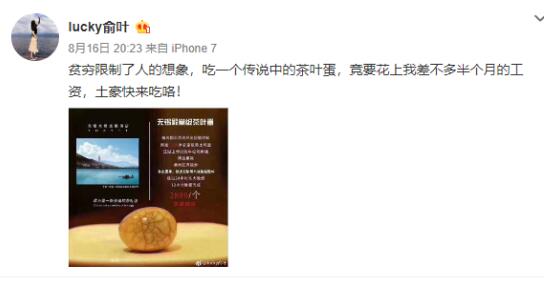 對(duì)于該茶葉的走紅,網(wǎng)友議論紛紛。有人認(rèn)為這是嘩眾取寵,和某針管書(shū)法家有異曲同工之妙,有人詢(xún)問(wèn)”吃了會(huì)上天?“,還有人一口認(rèn)定”這不是洗錢(qián)嗎“,也有網(wǎng)友就所謂”精選果碳、潮州紅泥炭爐“提出質(zhì)疑:”再牛逼的木材燒出來(lái)的火溫難道還有差別?“,更多網(wǎng)友自嘲,貧窮限制了人的想象,吃一個(gè)傳說(shuō)中茶葉蛋,竟要花上我差不多半個(gè)月的工資。
