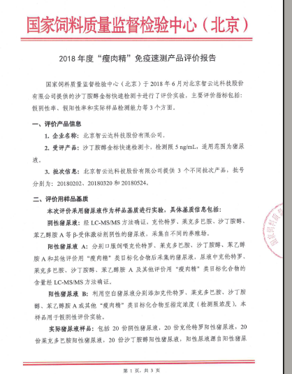 國家飼料質(zhì)量監(jiān)督檢驗(yàn)中心(北京)組織開展的“瘦肉精”免疫速測產(chǎn)品評價(jià)工作的結(jié)果近日公布,智云達(dá)報(bào)送的克倫特羅、萊克多巴胺、沙丁胺醇三種免疫檢測卡的假陰性率、假陽性率、實(shí)際樣品檢測能力,均滿足評價(jià)指標(biāo)要求!