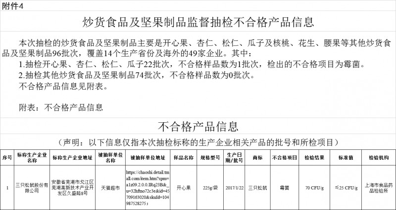 2017年8月15日,國家食品藥品監(jiān)督管理總局發(fā)布3批次食品不合格情況,其中就包括三只松鼠開心果,而不合格的原因則為霉菌超標(biāo)。