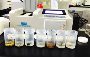 實(shí)驗(yàn)過程:實(shí)驗(yàn)人員分別稱取2克茶葉樣品,加蒸餾水泡開茶葉。然后加農(nóng)殘緩沖溶液、顯色劑、酶試劑等,搖勻靜置10分鐘后放進(jìn)檢測儀。儀器屏幕上便顯示出農(nóng)殘抑制率數(shù)據(jù)。