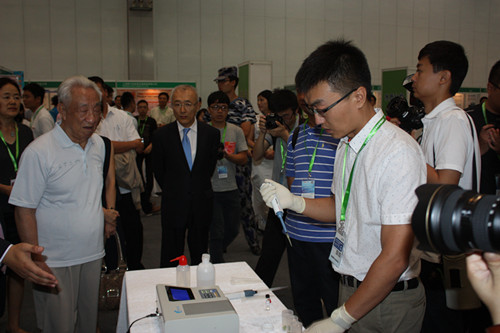 當(dāng)鄒家華首長來到展會的現(xiàn)場操作區(qū)時,智云達(dá)食品安全檢測工程師于勇的實(shí)驗(yàn)吸引領(lǐng)導(dǎo)駐足觀看,隨后鄒家華首長對現(xiàn)場進(jìn)行的農(nóng)藥殘留實(shí)驗(yàn)進(jìn)行了詳細(xì)的詢問,了解了食品快檢的工作原理及作用,提出了相關(guān)問題,并對目前的工作做出了指導(dǎo)。