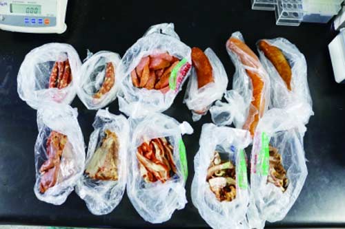 街邊熟食店、市場熟食攤購買的香腸4份、臘腸2份、肘子1份、豬頭肉2份、豬耳朵1份、豬蹄1份。