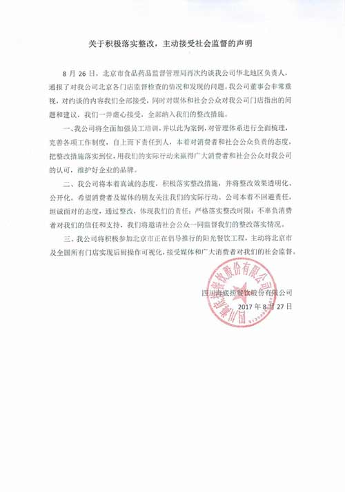 中新經緯客戶端8月27日電 27日下午,海底撈官網發(fā)布《關于積極落實整改,主動接受社會監(jiān)督的聲明》,表示對于北京食藥監(jiān)的約談內容全部接受,所有門店將實現(xiàn)后廚操作可視化。