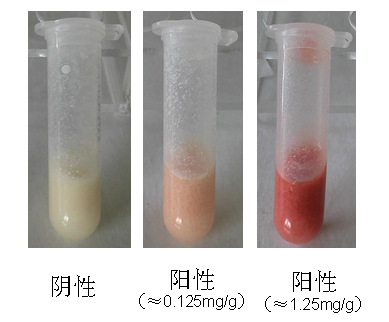 若反應(yīng)溶液變紅,可判定樣品中含有磺胺類物質(zhì),為陽性(+);否則判為陰性(-)。