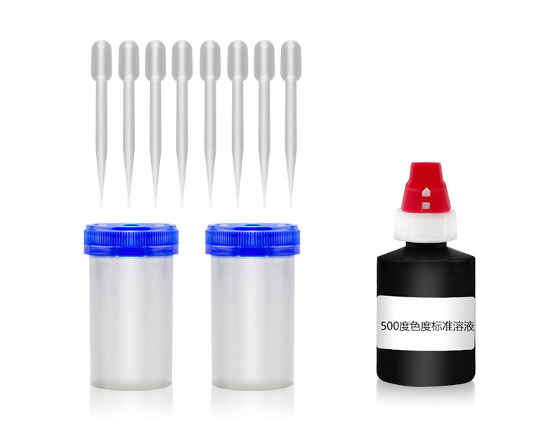 2. 為了增加色度的可視性,可取一只50mL塑料比色瓶,加入18滴(0.9mL)或24滴(1.2mL)500度的色度標(biāo)準(zhǔn)溶液,加入純凈水到30mL,相當(dāng)于15或20度的色度標(biāo)準(zhǔn)對照溶液。另一支比色管,加水樣到30mL,與色度標(biāo)準(zhǔn)對照溶液比對。