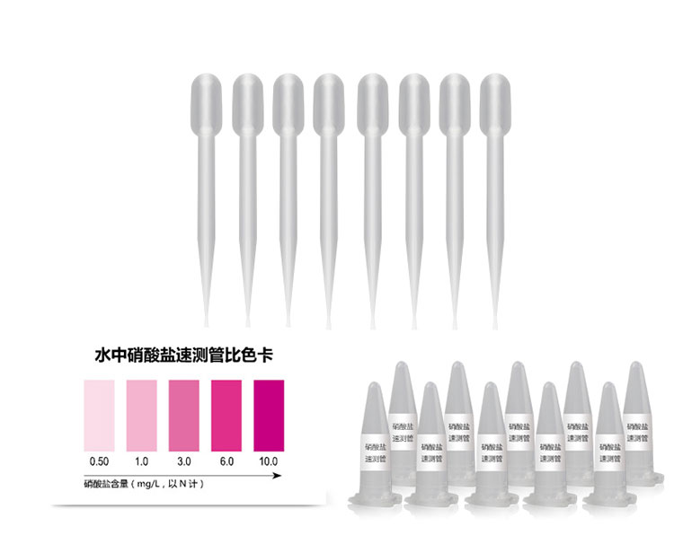 硝酸鹽是含氮有機物氧化分解的最終產物。如水體中僅有硝酸鹽含量增高,氨氮、亞硝酸鹽氮含量均低甚至沒有,說明污染時間已久,現(xiàn)已趨向自凈。此外,水中的硝酸鹽也可直接來自地層。本速測管適用于水中硝酸鹽的快速檢測。