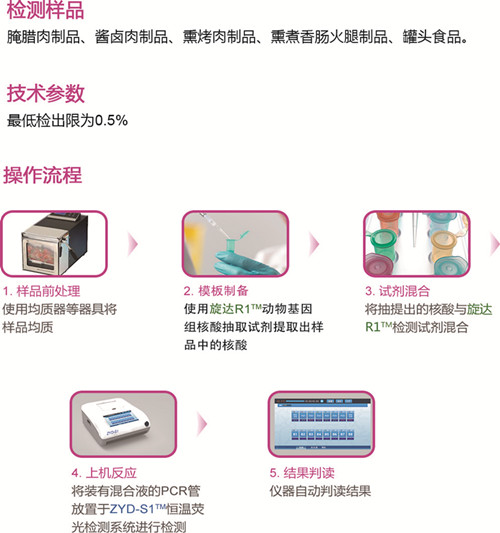 旋達(dá)R1?物種鑒定系列試劑,基于恒溫?cái)U(kuò)增技術(shù)平臺,以特別設(shè)計(jì)的2對特異性識別檢測靶標(biāo)的獨(dú)有基因序列,能快速、準(zhǔn)確地鑒定檢測出樣品中是否含有特定動物源成分,為識破食品摻假的違法活動提供有力依據(jù)。