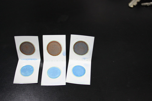 打開后的農(nóng)殘卡卡片白色藥片初變?yōu)樘焖{色。