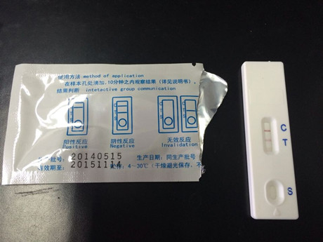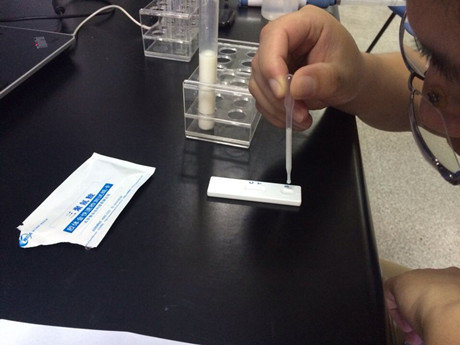 3、吸取待測樣品溶液,緩慢滴加80~100μl(約3~4滴)樣品液于加樣孔中,開始計(jì)時(shí),在3~5分鐘內(nèi)讀取結(jié)果。