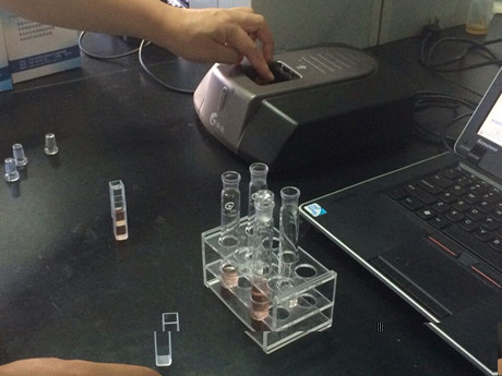 3、 樣品管:分別取0.4mL樣品液于10mL比色管中,做平行測(cè)試,分別加B溶液1mL、C溶液0.2mL,混勻,加D溶液0.4mL,搖勻,再加E溶液0.4mL,立即用蒸餾水稀釋至5mL刻線,搖勻,靜置20min,進(jìn)行檢測(cè)??瞻坠埽翰患覧溶液,其余步驟與樣品管同。