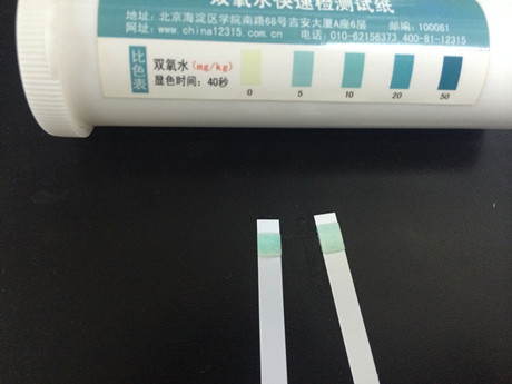 5、由于儀器的雙氧水檢出限為10mg/kg,決定用雙氧水試紙?jiān)衮?yàn)證一下。檢測(cè)結(jié)果:雙氧水含量在0-5mg/kg之間。