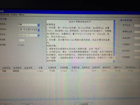 3、放入PCS食品安全快速檢測(cè)儀中檢測(cè),檢測(cè)結(jié)果,甲醇含量為3.5g/L,大于國(guó)家標(biāo)準(zhǔn)400mg/L.