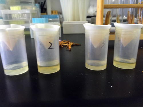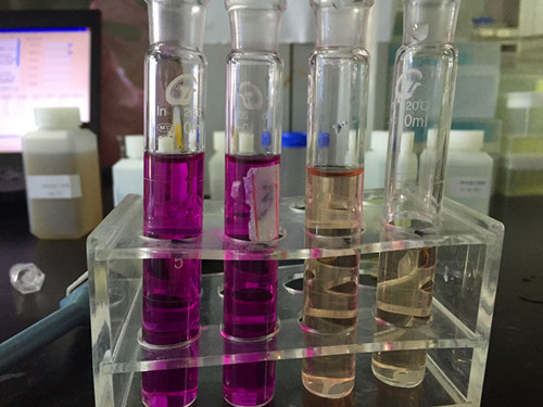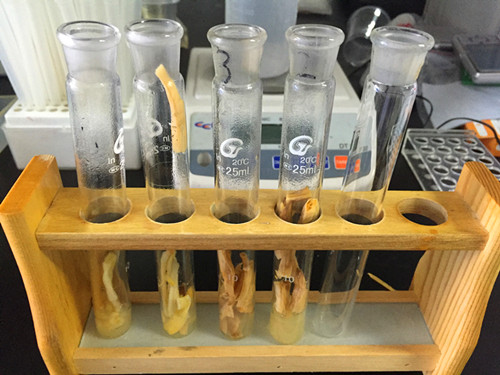 首先我們將各個(gè)樣本的黃花菜每個(gè)稱重1.25克放入25ml比色管中,加入0.5ml試劑C,加蒸餾水20mL,超聲浸提15min,由于上層溶液不澄清,加入A溶液和B溶液各0.5mL,然后加蒸餾水定容到25mL刻度線,搖勻,靜置5min,過濾,濾液(即樣品液)備用。