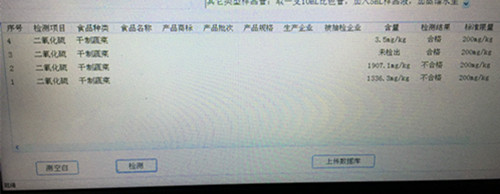 之后先用空白管校準(zhǔn),再檢測樣品管得到各個(gè)樣品二氧化硫含量都顯示只有2號(hào)為不添加二氧化硫的合格樣本,其他都添加了二氧化硫,但是其中1號(hào)為添加了少量二氧化硫的合格樣品,我國規(guī)定黃花菜中的二氧化硫的添加量為200 mg/kg,其他兩種含量分別為1907.1 mg/kg和1336.3 mg/kg,遠(yuǎn)遠(yuǎn)超出了我國的國家標(biāo)準(zhǔn),為不合格產(chǎn)品。