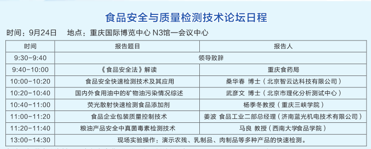 快檢培訓(xùn)班已在北京舉辦九期,第十期與往常不同,在重慶。您一定很好奇,為什么這次培訓(xùn)班安排在重慶,如果您關(guān)注我們的網(wǎng)站及微博、微信,您會(huì)發(fā)現(xiàn),智云達(dá)受邀參加由中國(guó)儀器儀表學(xué)會(huì)牽頭的四家機(jī)械行業(yè)專(zhuān)業(yè)組織2015年9月22日-25聯(lián)合在重慶國(guó)際展覽中心共同舉辦“中國(guó)(重慶)智能制造技術(shù)裝備博覽會(huì)”(簡(jiǎn)稱智博會(huì))。為了讓客戶和學(xué)員有參與高質(zhì)量技術(shù)論壇,學(xué)習(xí)更多除快檢常識(shí)外知識(shí)的機(jī)會(huì),本次培訓(xùn)班特改為參加食品安全與質(zhì)量檢測(cè)技術(shù)論壇。