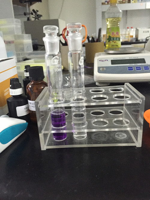 樣品管:取1 mL樣品液于10 mL比色管中,滴加4滴A溶液,再滴加4滴B溶液,搖勻,放置20 min,期間搖動(dòng)6次,再加入0.1 mL C溶液,搖動(dòng)30秒,放置5 min,用蒸餾水稀釋至5 mL刻度線,搖勻。