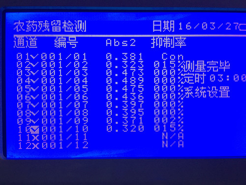 檢測結(jié)果如圖所示,結(jié)果以酶被抑制的程度,即抑制率表示。當(dāng)果蔬樣品提取液對酶的抑制率為40~50%時,則表明被測樣品為可疑農(nóng)殘超標(biāo)樣品;當(dāng)抑制率≥50%時,表示蔬菜中有高劑量有機(jī)磷或氨基甲酸酯類農(nóng)藥存在,樣品為陽性結(jié)果。所以樣品中農(nóng)藥殘留符合國家標(biāo)準(zhǔn)。