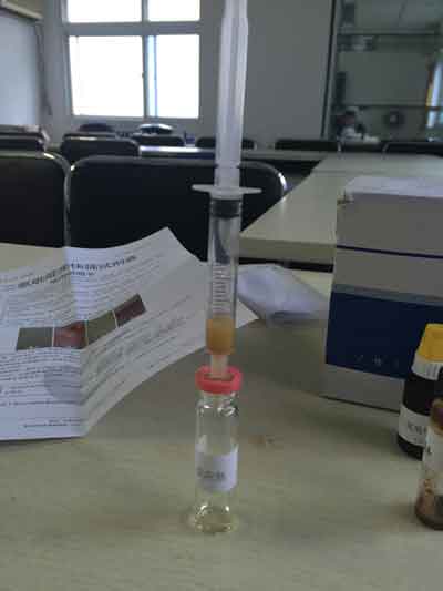 取1支注射器,拔出活塞,接過(guò)濾器,過(guò)濾器下端置于反應(yīng)瓶口上,將樣品上清液輕輕倒入針筒內(nèi),裝入活塞擠壓,收集濾液于反應(yīng)瓶?jī)?nèi)。