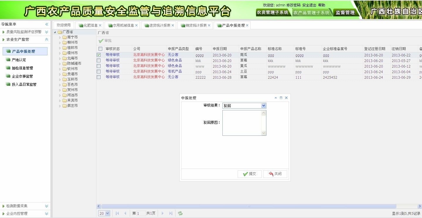 監(jiān)管部門負責處理三品產(chǎn)品的認證審核。審批結果包括通過和駁回,如此申報駁回需填寫駁回原因。如圖2-1所示