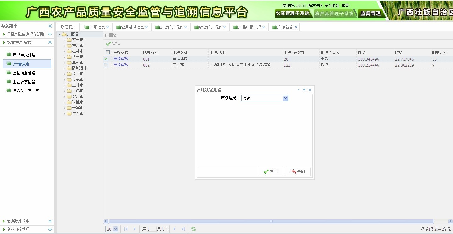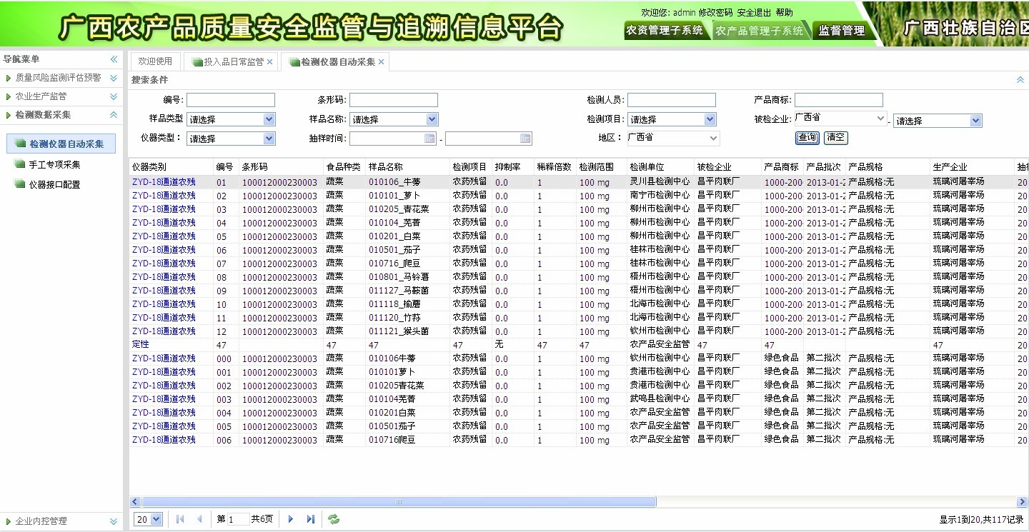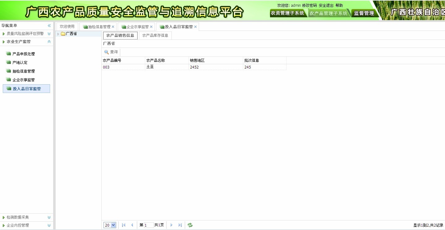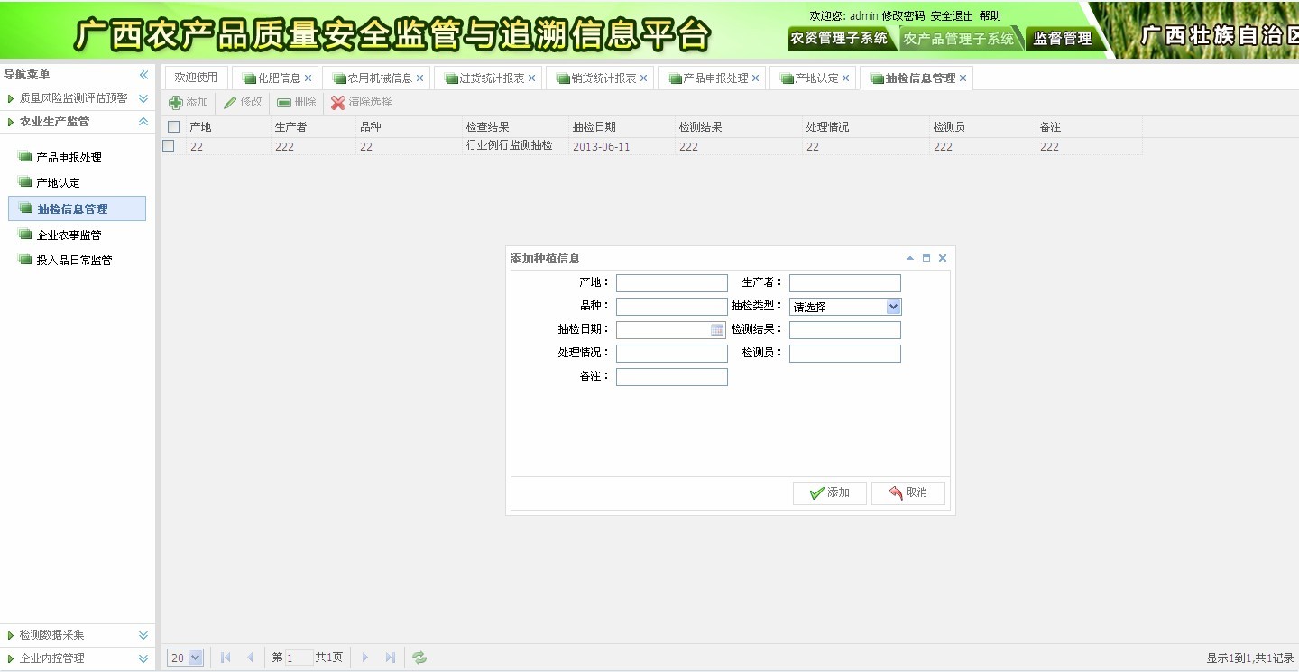 ? 抽檢信息管理:行業(yè)例行監(jiān)測抽檢,專項風險監(jiān)測,所含信息包括產(chǎn)地、生產(chǎn)者、品種、檢測結果、處理情況、檢測員等信息。如圖2-3所示